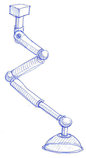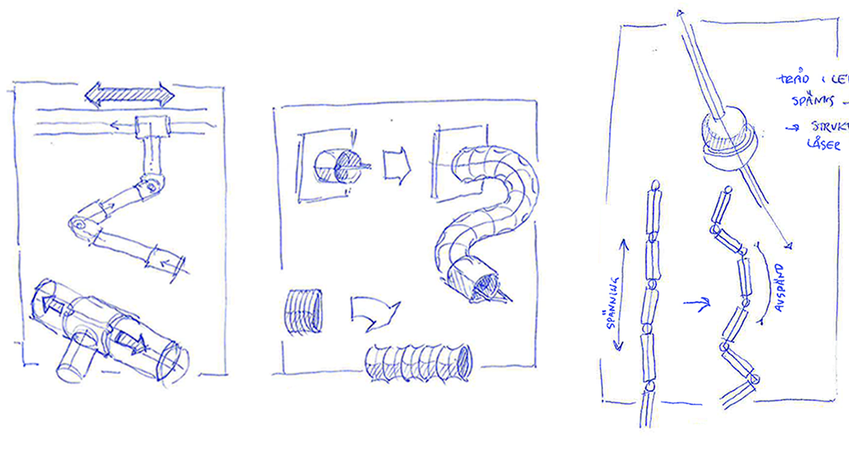 Various ideas were explored through sketching, guided by the keywords flexible, compact and maneuverable. The result was a concept involving ball sockets and a piston, which met the researchers' needs without needless complexity.